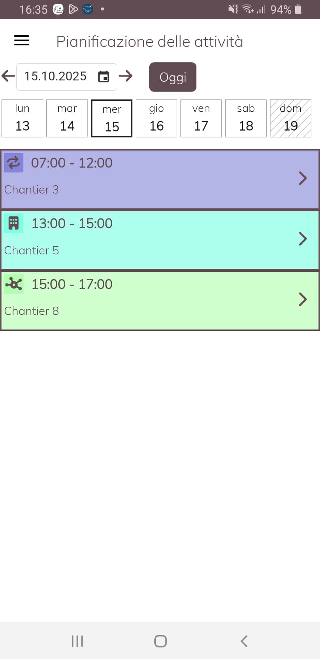 Per una migliore leggibilità, assegna colori distinti a ogni cantiere/progetto e dipendente. È possibile scegliere icone per tipo di cantiere/progetto per identificarli facilmente.