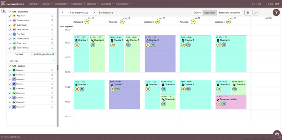 Il modulo di pianificazione delle attività di SwissWorkTime è lo strumento ideale per organizzare il lavoro dei vostri team con precisione e semplicità. Centralizzate la gestione dei vostri progetti e interventi grazie a un’interfaccia visiva e a funzionalità pensate per garantire la massima efficienza.